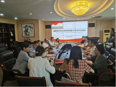 2023年8月27日下午,菲律宾国家大学校长Dr. Renato Carlos H.Ermita一行六人莅校交流,校长程灵、副校长萧罡、有关职能部门和二级学院相关负责人在马尾校区会见来宾,召开交流会。贝博官网池玫院长出席交流会,教师周文蕴为菲律宾国家大学校长一行提供翻译语言服务。