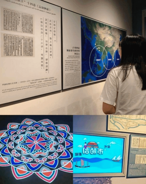 海交馆围绕“泉州湾古船及其伴随出土物、泉州宗教石刻、泉州外销瓷”等三大藏品精心布局,以海上丝绸之路的视角诠释古泉州与世界各民族交往交流交融的活动场景,采用声光电等科技手段,打造出“刺桐梦华图”沉浸式投影体验、“涨海声中万国商”宋元货运氛围投影、“泉州印度教造像舞姿”互动体验、郑和下西洋船队大场景视频等几十项数字化互动内容,生动呈现不同文明不同民族在古代泉州大地上交流互鉴、互融共生的历史事实。在讲解员的带领下,实践队成员们见证了泉州在宋元时期作为海洋商贸中心的盛况。