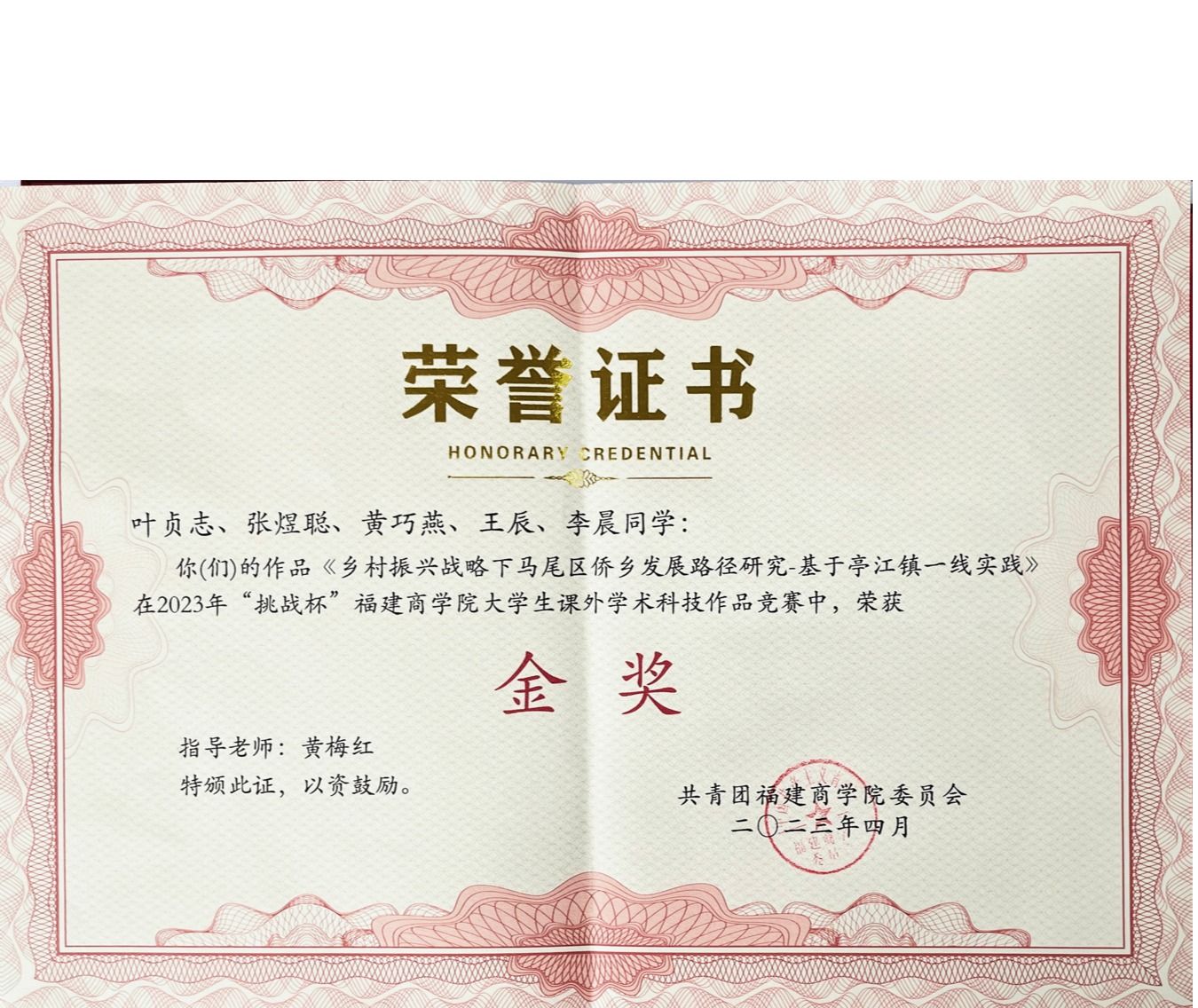 近日,由共青团福建商学院委员会主办的2023年“挑战杯”福建商学院大学生课外学术科技作品竞赛在连江校区明德楼落下帷幕。贝博官网21级日语3班叶贞志、21级日语2班张煜聪、20级日语2班黄巧燕、20级日语1班王辰、20级商务英语2班李晨五位同学的作品《乡村振兴战略下马尾区侨乡发展路径研究-基于亭江镇一线实践》(指导老师:黄梅红),在此次竞赛中荣获金奖。