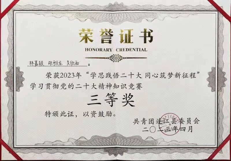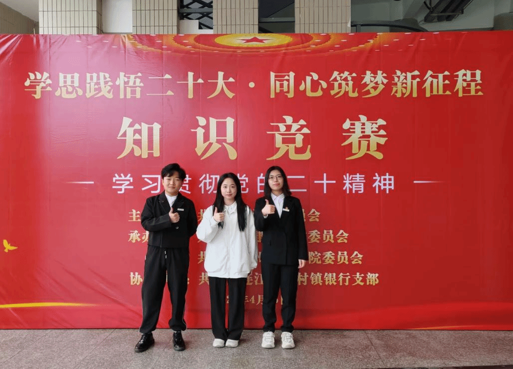 2023年4月25日,由共青团连江县委员会主办,共青团福建商学院委员会、共青团福州理工学院委员会承办,福建商学院学生协办2023年的“学思践悟二十大,同心筑梦新征程”学习贯彻党的二十大知识竞赛决赛于连江校区明德楼学生活动中心举行。由艾弗森贝博ballbet官网20级商务英语3班张雅龙,21级商务英语2班林嘉颖,21级日语1班吴欣雨三位同学组成的福建商学院第一代表队在竞赛中沉着冷静、协助作答,最终荣获三等奖的好成绩。