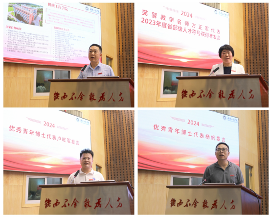 机械工程学院院长陈国强代表学校近五年人才工作业绩突出单位发言,分享了学院在人才引进、培养和激励方面的成功经验。MILE米乐2023年度省级称号获得者、芙蓉教学名师、教务处处长方正军,优秀青年博士代表卢旺军、杨帆先后作典型发言,分享了自己在教学、科研、社会服务工作中的心得体会。