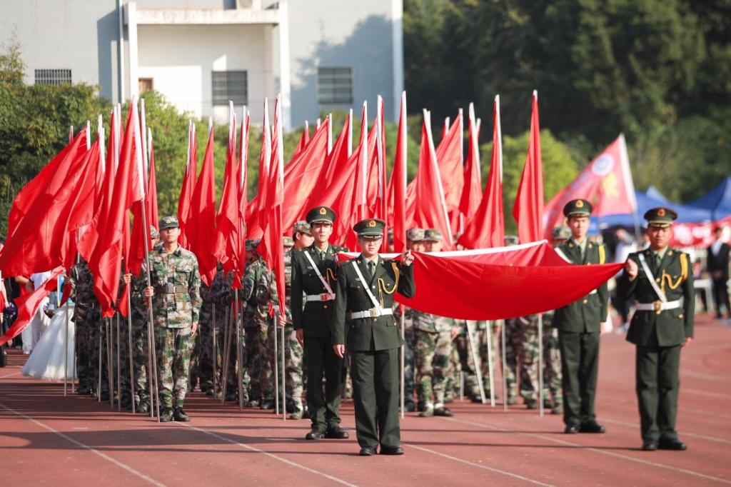 国旗护卫队迈着整齐的步伐,护送着鲜艳的五星红旗走向升旗台,全场师生肃立,高唱国歌,注视着五星红旗冉冉升起。
