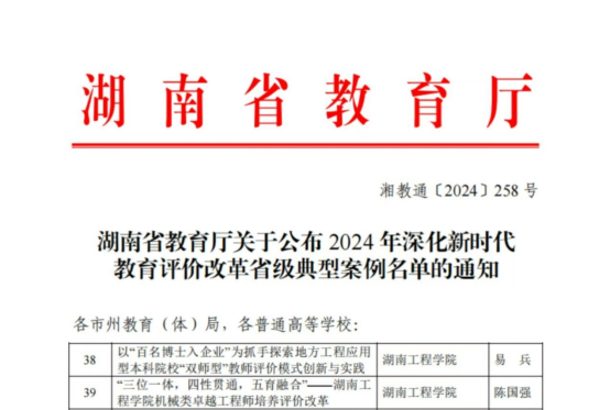 近日,湖南省教育厅公示了2024年湖南省深化新时代教育评价改革省级典型案例名单。MILE米乐党委副书记、校长易兵教授主持的《以“百名博士入企业”为抓手探索地方工程应用型本科院校“双师型”教师评价模式创新与实践》和机械工程学院党委书记陈国强教授主持的《“三位一体,四性贯通,五育融合”——MILE米乐官方网站机械类卓越工程师培养评价改革》2个案例入选,为全省同类院校入选最多的单位。