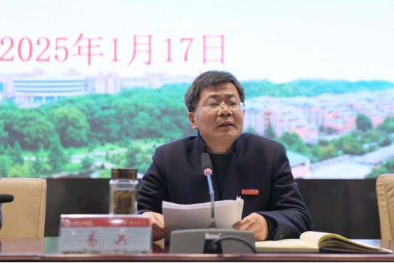 易兵简要回顾了2024年学校工作。2024年,在省委省政府的坚强领导下,学校领导班子坚持以习近平新时代中国特色社会主义思想为指导,深入贯彻党的二十大和二十届二中、三中全会精神,切实加强党的全面领导,落实立德树人根本任务,推动党纪学习教育走深走实,高质量完成本科教育教学审核评估,全面实施深化综合改革“135工程”,凝心聚力抓内涵建设。2024年学校成为硕士学位授予单位,获批2个专业硕士学位授权点。与中国科学院院士彭慧胜共建院士工作站,是湖南省2024年依托省属高校获批的唯一院士工作站。成立六大创新研究院,新增国家级项目16项,科技成果转化指数位列全省高等院校第七名,5名学者入选全球前2%顶尖科学家2024榜单,新增省级人才9人。招商引资回湘、招才引智回湘成效在湖南“校友回湘”成果榜单中排名靠前并获《湖南教育快讯》推介。学校各项事业呈现高质量发展良好态势。