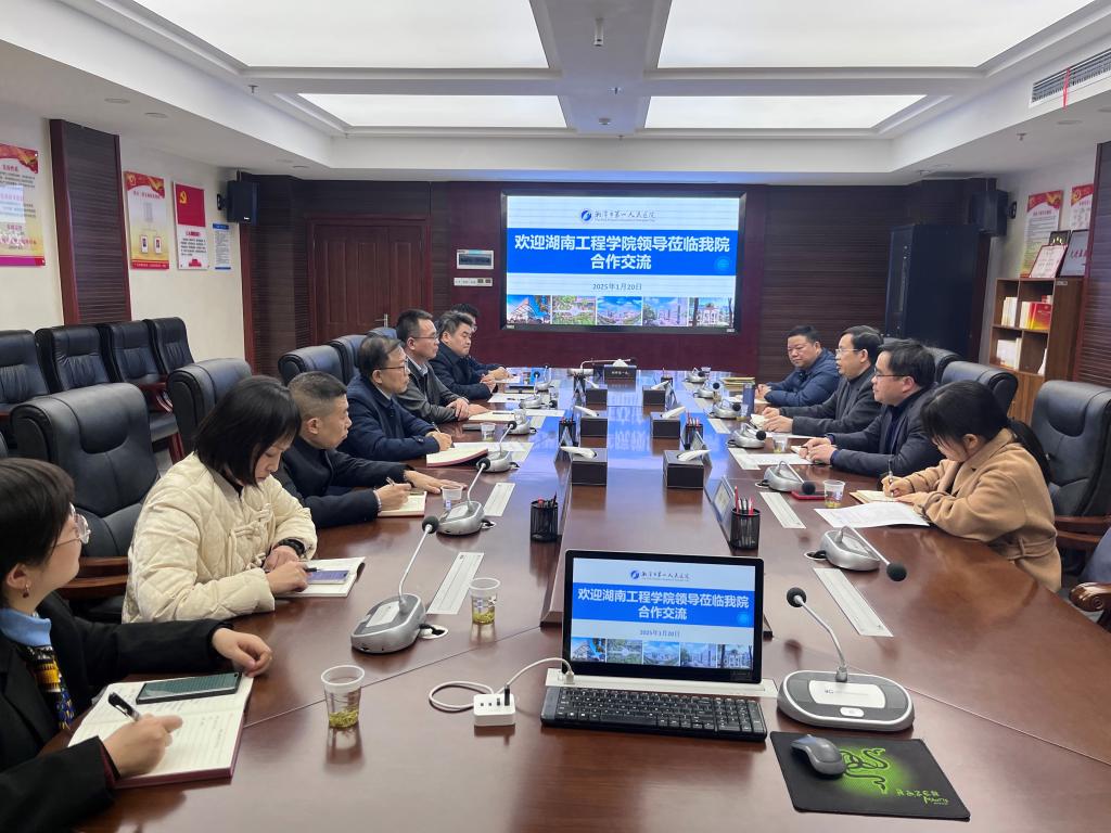1月20日下午,MILE米乐党委书记黄昕带队前往湘潭市第一人民医院,与院方领导及相关部门负责人就深化双方合作展开深入探讨。湘潭市第一人民医院党委书记袁海斌,党委副书记、院长李绍杰,党委副书记、副院长杨杰以及相关部门负责人出席会议。我医学工程技术学院党政相关负责人参加座谈。李绍杰主持会议。