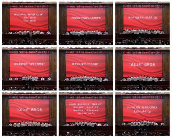 会议对在2024年高校辅导员工作研究与实践、学生资助、“七彩假期”志愿服务、国家奖学金、“中国大学生自强之星”、“芙蓉学子·榜样力量”等评选中荣获全国、湖南省先进集体、优秀团队和个人予以表彰;对在2024年度学校团学工作中表现突出的各类集体和个人等予以表彰。选树典型榜样,激发奋进力量。