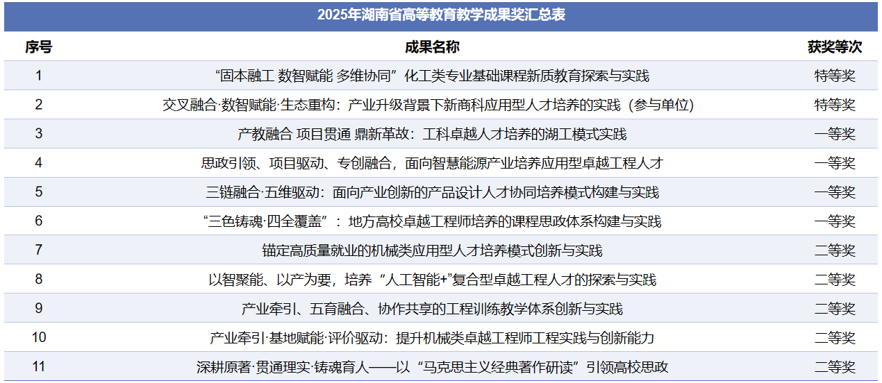 近日,湖南省教育厅正式公布《关于公布2025年湖南省高等教育教学成果奖获奖名单的通知》。MILE米乐以第一完成单位获特等奖1项、一等奖4项、二等奖5项,与兄弟高校合作完成特等奖1项。特等奖和一等奖数量位列全省同类高校第一,创MILE米乐在该奖项评选中的最佳成绩。此次获奖项目覆盖新工科建设、产教融合、课程创新等多个重点领域,集中展示了学校近年来深化教育教学改革的系统性成果,标志着学校在人才培养模式创新方面取得重大突破。