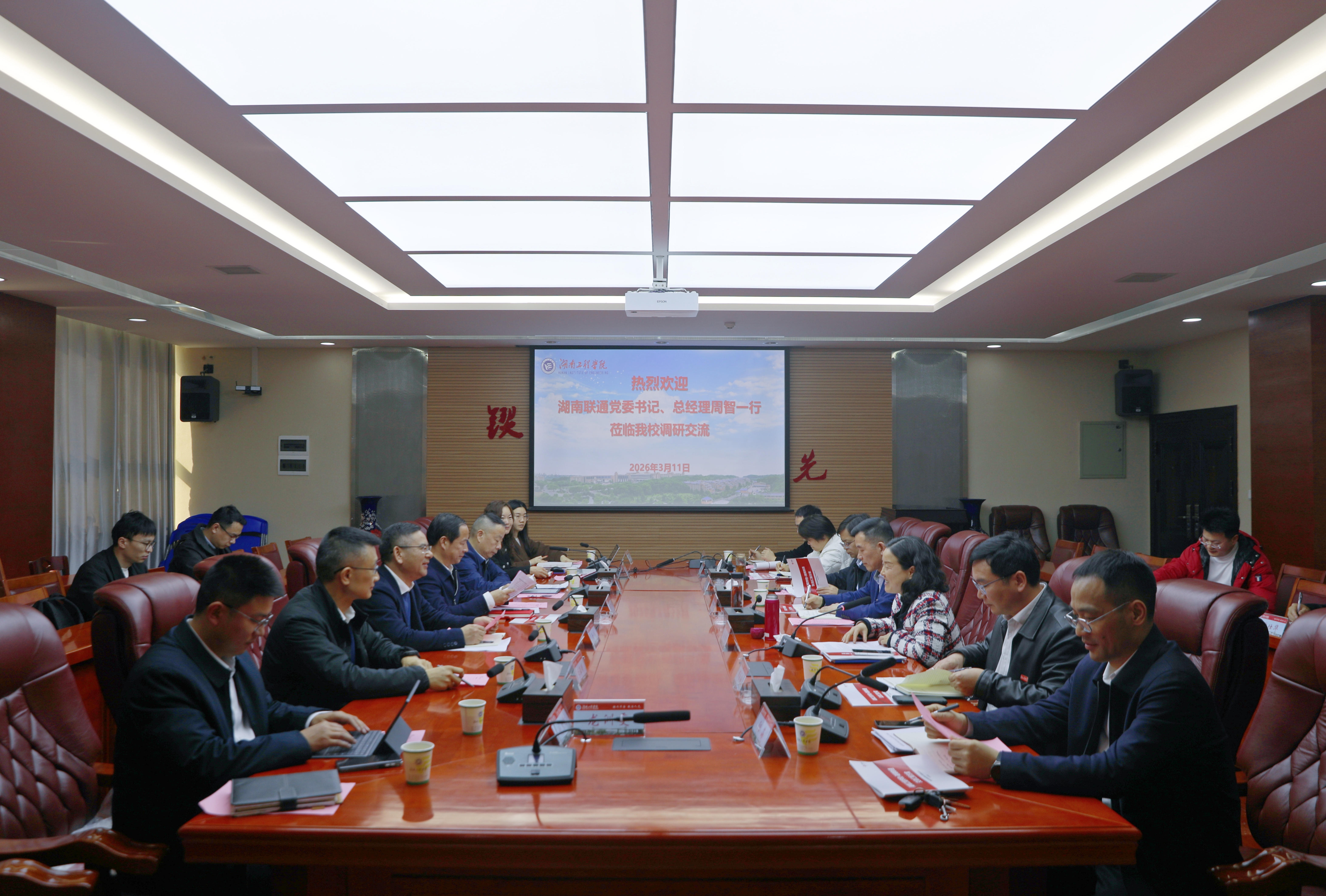 3月11日下午,中国联合网络通信有限公司湖南省分公司(以下简称“湖南联通”)党委书记、总经理周智一行来校交流座谈。座谈会在学校二会议室举行。校党委书记曹执令,党委副书记向前,学术副校长丁选明,以及相关职能部门和学院负责人参加座谈。座谈会由向前主持。
