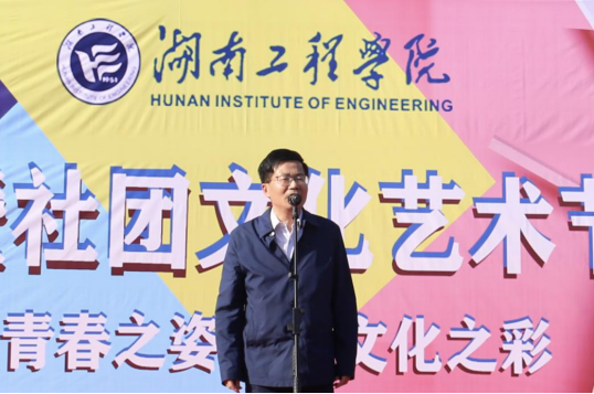 陈岳堂在开幕式上致辞,他代表学校向精心准备艺术节的师生们表示诚挚的问候和衷心的感谢。他指出,学校历来重视校园文化建设和文化育人工作,以校园文化、社团文化艺术节作为大学生思想政治教育的有效载体,引导全校师生培育和践行社会主义核心价值观,全面推进学校精神文明建设,搭建起大学生致力文化繁荣、服务社会、增长才干的实践舞台。他希望,广大湖工学子以饱满的热情积极投身活动,以创新的姿态迎接挑战,用精湛的水平书写青春,共同谱写学校校园、社团文化百花齐放的精彩华章。
