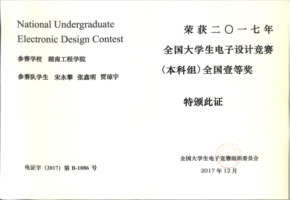 学院学生荣获2017年全国大学生电子设计竞赛一等奖2项