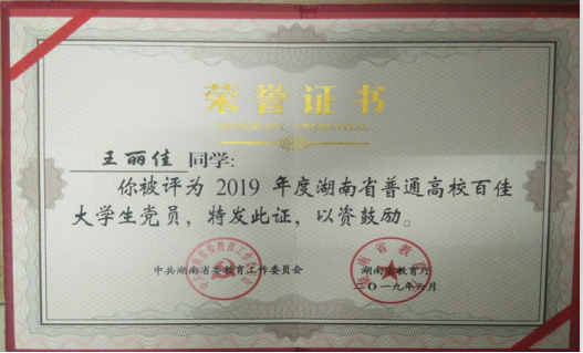 学院学生王丽佳获评2019年度湖南省百佳大学生党员