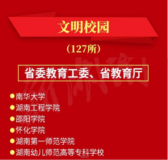 2020年,学校在获评“湖南省文明高等学校”基础上,积极开展“湖南省文明校园”建设工作。将文明创建融入学校顶层设计、融入改革发展大局、融入师德师风建设、融入学生成长成才,坚持以人才培养为中心,从党的建设、教职工思想政治教育、学生思想素质提升、校园文化建设、教学科研能力提升等方面发力,不断丰富创建活动载体,打造文化品牌,加强浸润感染,营造优良育人环境,不断提升文明创建工作的水平与质量,取得了良好的工作实效。