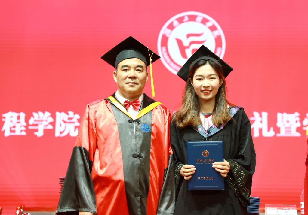 校领导、各学院院长为每一位毕业生拨穗正冠,颁发学士学位证书。帽穗从右到左轻轻一拨,掠过的是校训碑下的匆匆岁月,忆起的是木鱼湖畔的灼灼青春。拨穗礼不仅是代表学生学有所成,也是学校见证学子的成长过程。“当老师为我‘拨穗’的时候,我的心情非常激动,在我看来,这是一项神圣而庄严的仪式。我们的毕业,仪式感满满。”省优秀毕业生、机械工程学院焊接技术1701班曾富表示。