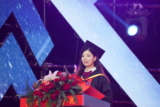“今日过后,从五湖四海奔赴而来的我们终将朝五湖四海奔赴而去。虽时光飞逝,却带不走春秋四载恩师情;虽曲终人散,却散不了朝朝暮暮同窗谊。”经济学院金融工程1701班孔迪作为毕业生代表发言。她回顾了在湖工的精彩点滴,感恩母校的栽培、感念四年的师生情谊。在校生代表、设计艺术学院产品设计1801班李诗华为毕业生们送上了真挚祝福,“祝愿学长学姐们用奋斗去实践青春无悔的诺言,在最广袤的天空下像雄鹰一般展翅翱翔”。