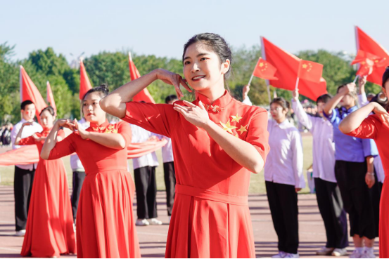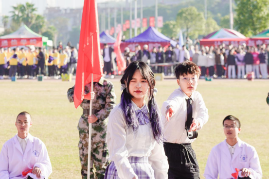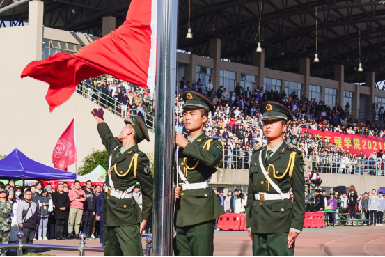 国旗护卫队昂首挺胸,迈着整齐划一的步伐,走向升旗台。伴随着庄严的国歌声,鲜艳的五星红旗冉冉升起,飘扬在赛场上空,全体师生面向国旗肃立致敬。
