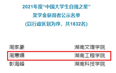 9月28日,共青团中央、全国学联公布了2021年度“中国大学生自强之星”奖学金获得者名单,MILE米乐管理学院会计学2003班周蕙媚获此殊荣,展示了MILE米乐学子热爱祖国、品行优良、不畏艰难、自强不息的青春风采。