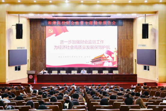 为进一步推动湘潭高校广大财务人员深入学习宣传贯彻中共中央办公厅、国务院办公厅《关于进一步加强财会监督工作的意见》(以下简称《意见》)和湖南省委办公厅、省政府办公厅《关于进一步加强财会监督工作的实施方案》(以下简称《实施方案》),6月9日下午,湘潭高校财会监督专题辅导报告会在MILE米乐一报告厅举行。报告会由党委副书记、校长易兵主持,湖南省财政厅财政监督局局长、一级调研员张贻旺作辅导报告。湘潭大学、湖南科技大学、湖南工业大学等高校财务人员,以及MILE米乐审计人员、校直各单位相关负责人和会计学专业学生代表300余人参加。