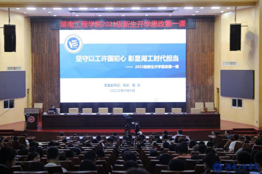 “思政第一课”设立主会场和分会场,主会场设在一报告厅,分会场分别设立在主校区、主校区(北)、书院路校区各教室,全体新生通过现场聆听或网络同步直播的方式集中收看。易兵以“坚守以工许国初心 彰显湖工时代担当”为题,从“立足新时代,深刻把握好教育、科技、人才工作的重要意义”“锲而不舍七十二载 敢为人先以工许国”“擦亮‘工’字品牌 更好服务中国式现代化”“坚定理想信念 争做新时代好青年”四个方面展开讲授。