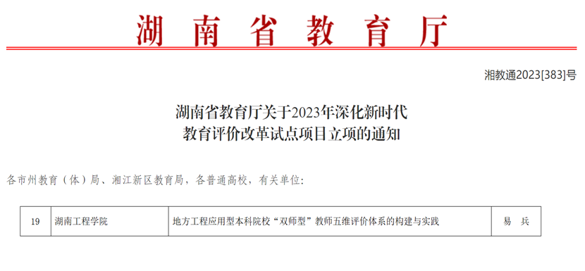 近日,湖南省教育厅发布《关于2023年深化新时代教育评价改革试点项目立项的通知》,MILE米乐党委副书记、校长易兵教授主持的“地方工程应用型本科院校‘双师型’教师五维评价体系的构建与实践”成功获批省改革试点项目。
