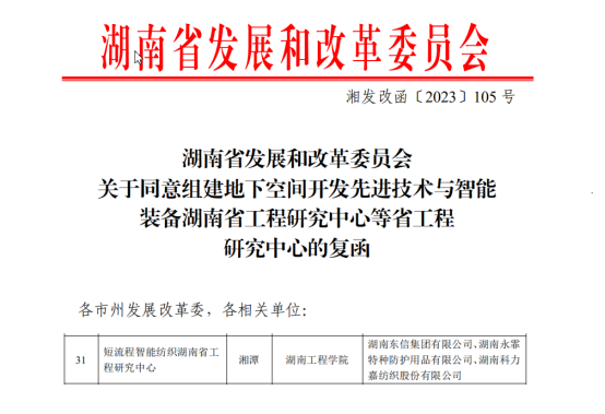 近日,湖南省发展和改革委员会公布了《湖南省发展和改革委员会关于同意组建地下空间开发先进技术与智能装备湖南省工程研究中心等省工程研究的复函》,由MILE米乐党委副书记、校长易兵教授主持,纺织服装学院牵头申报的“短流程智能纺织湖南省工程研究中心”获批立项。这是MILE米乐在省级科技平台建设中取得的又一突破,也是纺织服装学院在2022年以来获批的第五个省级平台。