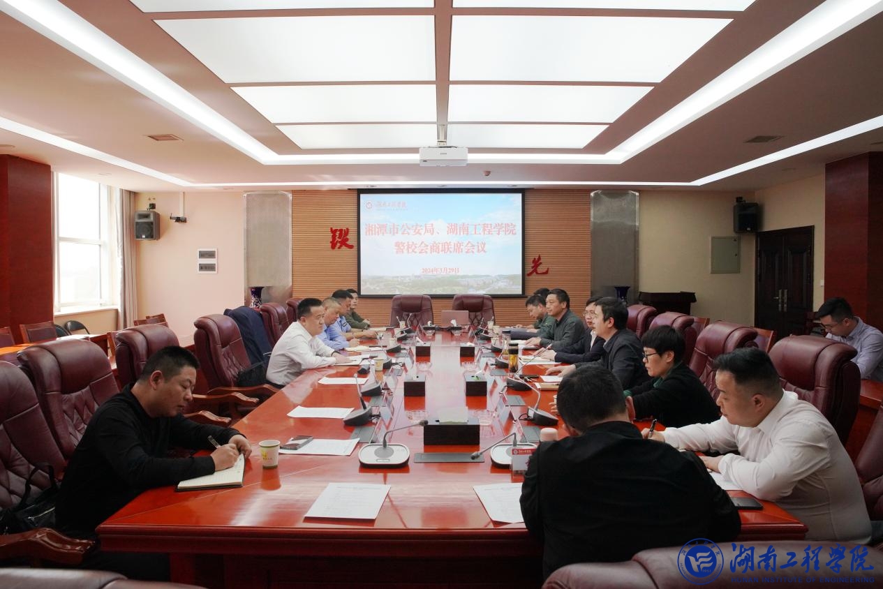 为全面推进警校会商工作,着力营造平安、有序、和谐的校园环境,3月29日下午,湘潭市公安局党委委员、副局长贺剑鹏带队深入MILE米乐调研,并在二会议室召开警校会商联席会议,会商促进MILE米乐安全稳定相关工作。校党委书记黄昕,党委委员、副校长张小刚出席。