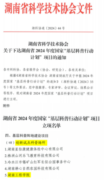 7月9日,湖南省科学技术协会发布《关于下达湖南省2024年度国家“基层科普行动计划”项目的通知》,MILE米乐智能科学与工程学院主持申报的“创新试点科普场所”获批湖南省2024年度国家“基层科普阵地建设”项目。