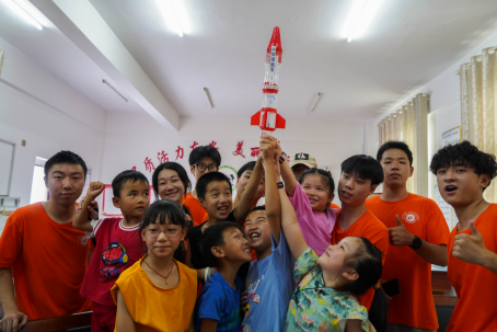 7月14日上午,实践团成员向小朋友们讲述湖南籍科学家杨孟飞院士为航天事业贡献的成就和航天故事,还向大家介绍了新中国的航天成果。小朋友们纷纷表示,自己将来也要成为国家的栋梁之才,为祖国航天事业贡献力量。最后,实践团成员带领小朋友们亲手制作了简易火箭。当自制火箭成功升空的那一刻,大家心里都充满了自豪。