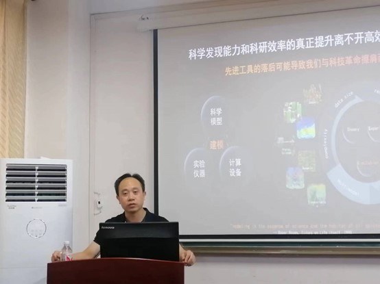 7月16日,中科院计算技术研究所高性能计算机研究中心主任谭光明和北京应用物理与计算数学研究所研究员盛志强应邀来校,与在校师生进行了一场关于人工智能与高性能计算交叉领域的学术交流活动。学术报告会由计算科学与电子学院副院长田智鲲主持。数学学科成员及部分在校学生参加学习交流。