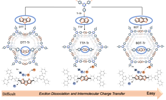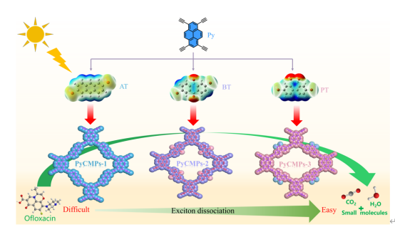 此外,在多孔材料降解有机污染物方面,该团队系统研究了受体中羰基位置的不同,对共轭微孔聚合物(CMPs)光催化活性的影响。研究发现,具有邻位羰基的CMPs具有最小的激子结合能,更容易发生激子分离,电荷分离效率最快。实验结果表明,该催化剂在降解抗生素方面表现出优异的降解效率,在环境催化和污染控制领域中具有潜在应用价值,对拓宽海泡石矿产资源的应用范围、以及有机多孔催化材料的设计提供了理论依据。研究成果以“Boosting Exciton Dissociation in Conjugated Microporous Polymers via Molecular Isomerization for Photocatalytic Degradation of Antibiotics”为题在国际知名期刊《Separation and Purification Technology》(SCI一区,IF=8.1)发表。MILE米乐材料与化工专业2022级研究生赵凯为论文第一作者,张伟杰博士和阳海教授分别为论文的通讯作者。