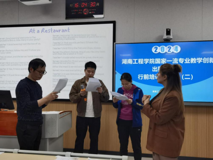 10月28日下午,外国语学院苏静博士在C308为出国研修团进行西方礼仪行前培训,详细讲解了见面礼节、着装、用餐等知识,强调了涉外文明礼仪注意事项。外籍教师Linda进行了语言培训,根据不同生活场景模拟情景对话,并将团员分组开展实景演练。