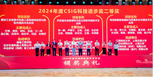 在面向具身智能的图像图形技术论坛上,万琴教授受邀作《自主作业机器人视觉感知系统研究及应用》学术报告,针对复杂工业场景中移动机器人视觉感知与控制的关键技术难题,她分享了团队在轻量化特征提取与目标检测、多运动目标遮挡跟踪及机械臂定位抓取等方面的研究成果,探讨了具身智能环境下自主作业机器人视觉感知系统的创新应用。在Panel讨论环节,万琴作为受邀嘉宾参与交流讨论,她指出具身智能依靠多模态视觉感知与图形仿真实现交互,涵盖感知、语义理解、动态图像分析及仿真渲染等层面关键技术,还分析了这些技术在端到端 VLA 模型中的作用,强调未来需突破架构瓶颈,以世界模型为核心提升机器人复杂环境适应能力。此外,万琴团队与长沙长泰机器人有限公司、湖南大学、中冶京诚(湘潭)重工设备有限公司携手攻关,凭借在图像图形技术创新应用方面的突出贡献,荣获2024年度中国图象图形学学会科技进步奖二等奖,大会现场举行了颁奖仪式。