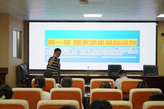 报告会上,文学锦围绕国家质量基础设施建设和当代大学生发展两大主题展开阐述。在国家质量基础设施建设方面,他立足行业发展现状,从计量标准与检测检验两个维度切入,深入解析质量基础设施建设的战略意义。围绕管理体系,他重点解读了新目标下的审核流程与实施要点,为师生构建了清晰的认知框架。