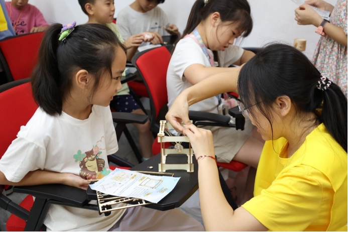 企业车间成为实践教学的生动课堂。在“技术能手面对面”活动中,成员们近距离观摩智能梯级热成型、高自动化配液等前沿技术应用,拓展专业视野,感知产业脉搏。社区科普环节中,实践团设计“科技手工指导”特色课程,通过带领儿童制作简易机械模型,将专业知识转化为趣味实践,激发青少年科学探索热情。