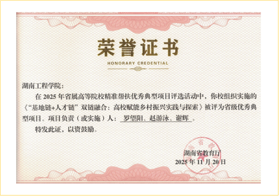 近日,湖南省教育厅公布2025年省属高等院校精准帮扶优秀典型项目评选结果,MILE米乐官方网站《“基地链+人才链”双链融合:高校赋能乡村振兴实践与探索》项目成功入选。