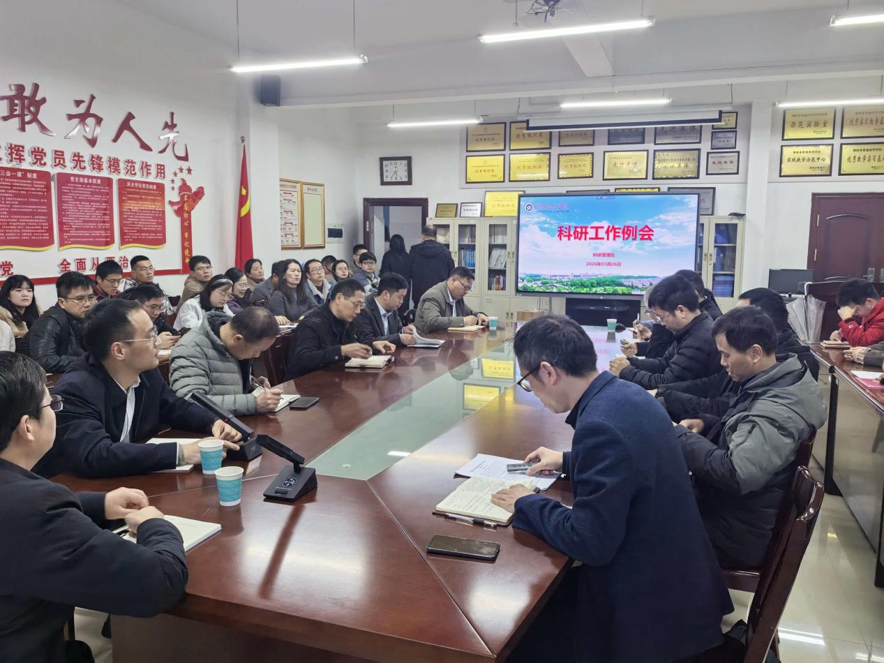 科研管理处相关人员汇报2026年一季度科研工作推进情况,详细解读自科、社科各类项目申报时间节点及结题要求,通报学校国际杰青计划、国家自然科学基金、芙蓉计划等项目申报进展,并对比省内高校一季度科研合同成交额,为后续科研工作找差距、明方向。