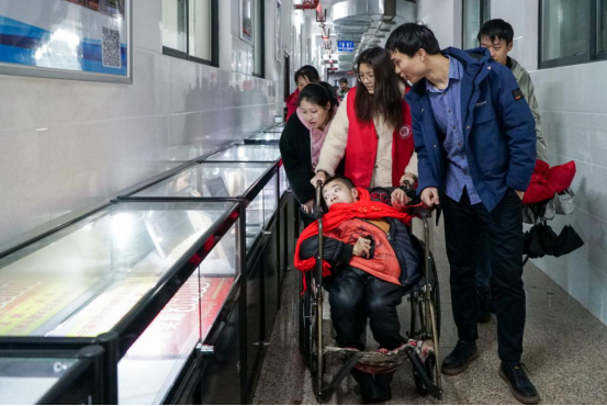 “还想看更多”,坤坤向志愿者们撒娇。学生作品展览在设计艺术学院三楼学生工作室,下过雨的楼梯格外滑,志愿者们紧紧抓住轮椅扶手,小心地抬着轮椅,一步一步抬上工作室。天气有些寒冷,志愿者的头上仍冒出了汗珠。3D打印的汽车、高楼、笔、花瓶……这些栩栩如生的小物品让坤坤、寅寅大开眼界。“挑选两个,送给你们。”设计艺术学院老师说道。