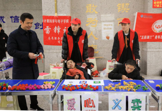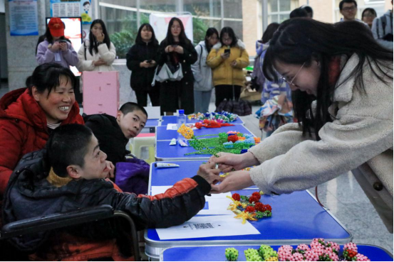 除了体验大学生活,坤坤、寅寅还将自己做的“蜻蜓”“小狗”“草莓”“中国结”“玫瑰花”等手工串珠带到了校园,参加雷锋社爱心义卖活动。“这是我们做的手工串珠,大家快来看看。”坤坤、寅寅吆喝着。“你们的手工做得很精致,可以教教我们吗?”听到大学生们的称赞,兄弟俩笑容灿烂。一位特殊的顾客来了——该校副校长张小刚看到两兄弟的手工作品连连称赞,“欢迎你们来到学校,希望你们能常常过来体验大学生活。你们的手工艺品做得非常精美,这是你们用自己的双手创造的,这种自强不息的精神值得我们学习。”张小刚买下了一个“中国结”和一个“草莓”挂饰。