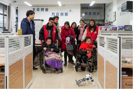 在电气与信息工程学院大学生创新创业实践基地,一个机器人引起了他们的注意。“来,你们也来试一试。”在老师的引导下,坤坤、寅寅拿起控制器一按,机器人一会儿走路,一会儿做俯卧撑,一会儿翻跟头,一会儿跳舞,不停变换各种姿势。“太厉害了!”他们和志愿者鼓掌欢呼起来。