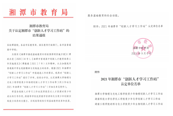 9月6日,湘潭市教育局公布了2021年湘潭市“创新人才学习工作站”认定名单,MILE米乐材料与化工学院青少年生物创新人才学习工作站成功获批。