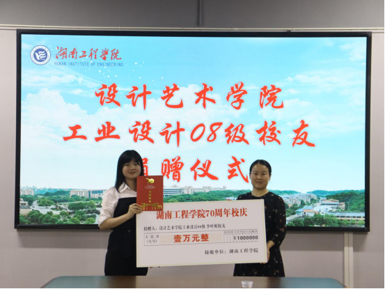 9月9日下午,设计艺术学院工业设计专业2008级李叶妮、陈玄哲两位校友为母校建校七十周年捐赠仪式在五教会议室举行。校党委委员、副校长向前出席,校友办、设计艺术学院相关负责人,工业设计专业0802班班主任彭烈洪及部分学生代表参加捐赠仪式。设计艺术学院院长王兴业主持仪式。