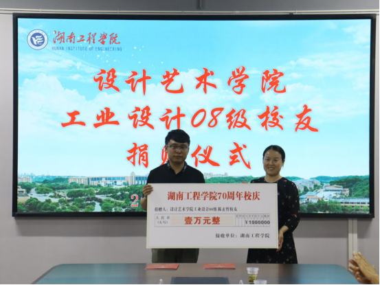 王兴业简要介绍了学院近年来发展情况,并介绍了两位校友。他指出,两位校友分别是就职于校团委的李叶妮老师和学生工作处的陈玄哲老师。他们用实际行动完美诠释着“树高千尺不忘根,水流万里总思源”,求学于湖工,工作于湖工,成家立业于湖工,湖工成了他们最亲近的地方。值此学校建校七十周年之际,他们把对母校的爱化作心意,以个人名义各向学校捐赠人民币1万元,为母校发展献出绵薄之力。