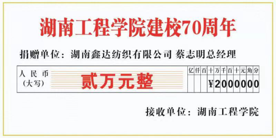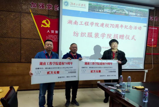 在MILE米乐建校七十周年之际,湖南鑫达纺织有限公司董事长、棉纺81012班郭国清校友,湖南鑫达纺织有限公司总经理、棉纺79011班蔡志明校友各向学校捐赠两万元,助力纺织服装大楼建设。