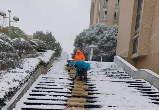 12月25-26日,一场长时间的大降雪将湘潭笼罩,一夜间湖工也被厚厚的白雪覆盖。为确保师生安全出行和道路交通安全,学校学生管理工作人员、保卫工作人员、后勤保障工作人员、宿舍管理工作人员、师生齐上阵,铲除各道路积雪 ,各楼栋、宿舍区门前的积冰,在道路口维持交通,保证教学秩序的正常进行。