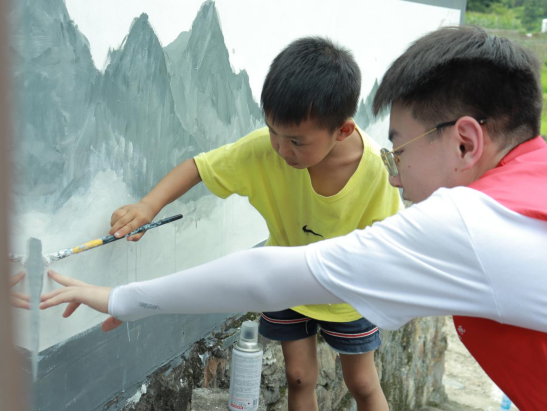 “我们可以一起画吗?”“这样涂色对吗?”铺坪村的小朋友们兴致勃勃。一双双大手扶着小手,一笔一笔绘墙绘的场景,在烈日下分外耀眼。近日,设计艺术学院“设计下乡创意落地”实践团队走进怀化市会同县坪村镇铺坪村开展暑期社会实践活动,大学生志愿者化身“艺术家”,给村里一面面原本单调的墙壁,穿上了色彩斑斓、内容丰富的文化外衣,“画”上了美丽乡村新“妆容”。