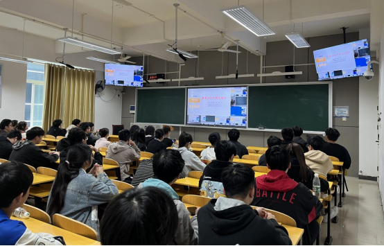 本次授课依托MILE米乐新建的14间智慧互动型教室,首次采取“1主讲课堂+13听讲课堂”教学模式。在主讲教室,侧边屏幕能显示出听讲教室学生的画面,同时教师讲课的镜头和PPT画面也实时传送到了13间听讲教室。