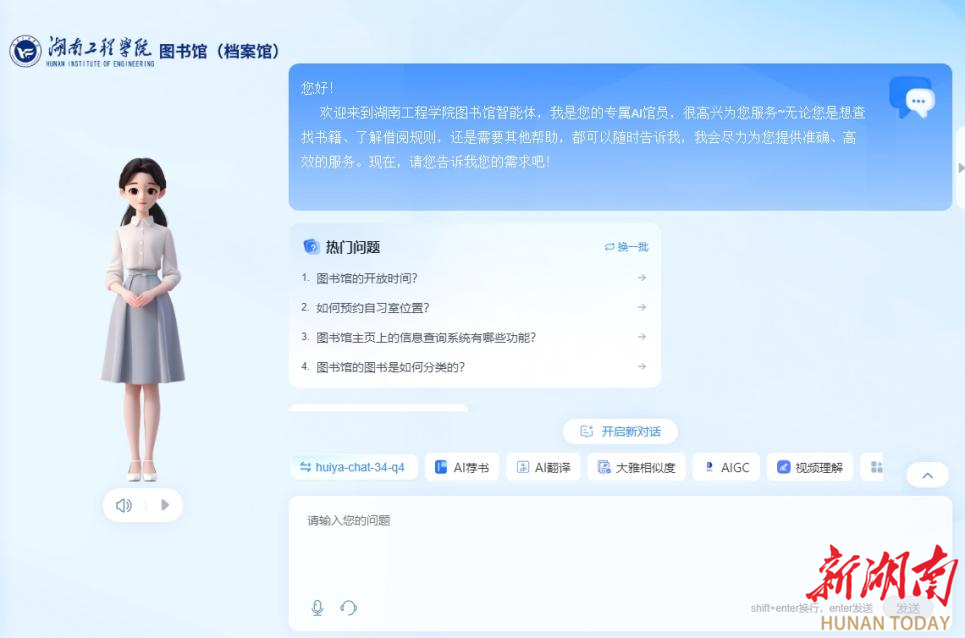 读者登录图书馆官网(http://tsg.hnie.edu.cn/),点击左边快捷导航“AI馆员”界面,即可与AI馆员对话。目前,该校已对接图书馆纸质图书管理系统、数字资源及图书馆业务,将为读者提供业务咨询、智能查书、学术资源检索、个性化荐书等功能。