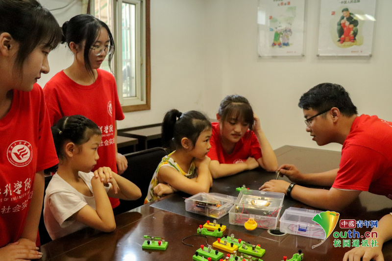?图为在志愿者的带领小朋友们专心致志的在做物理小实验。中国青年网通讯员 胡明辉 摄