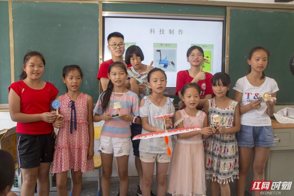 “老师,我把我的小作品送给您,您辛苦了。”这是在电气信息学院暑期社会实践团在成功开展“科技引领未来”小制作课堂后,一位小朋友对志愿者说的话。“科技引领未来”小制作课堂是MILE米乐官方网站电气信息学院暑期社会实践团在湖南省怀化市溆浦县思蒙镇中心小学开展科教帮扶活动的一个部分,旨在激发孩子对科技的兴趣,培养孩子的动手能力,为科技创新埋下种子。教室最前排的两个小女孩热情的问道:“老师,你们热不热呀?看你们都满头大汗的,快坐下来歇歇吧!”说完便起身为他们搬凳子,这细微的动作令志愿者们甚是暖心。