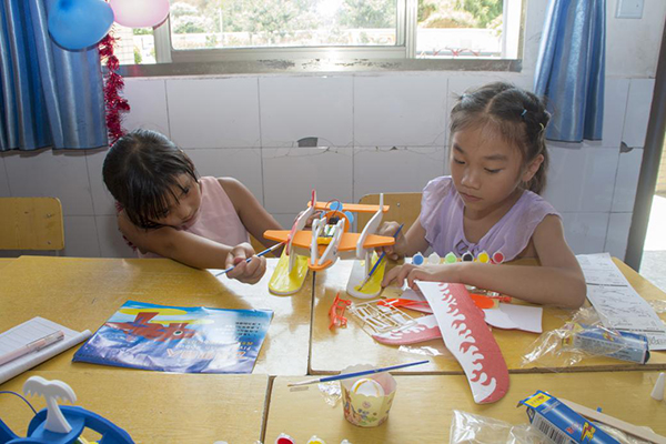 课堂上,志愿者们发挥专业优势,将科学知识带进课堂,在对科技作品逐一展示的同时,将其科技原理用通俗易懂的方式与孩子们进行互动交流,深入浅出。随后志愿者带领40名学生进行现场DIY科技作品,孩子们根据自己的喜好选择想要制作的小作品,在志愿者的耐心指导和细心讲解下,孩子们认真制作,当遇到困难时也积极地向志愿者们求助。一个半小时之后,一件件科技小作品被展示出来:电动滑行飞机、双翼风力赛车、泡沫小冲锋艇等。孩子们争着上台讲解演示自己精心制作的小作品,直呼被科技的神奇与奥秘所吸引。