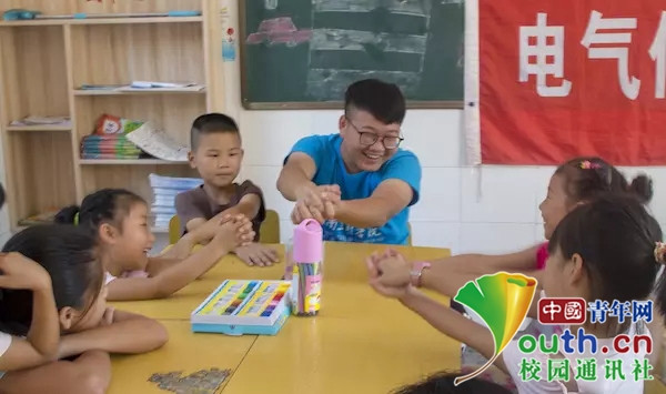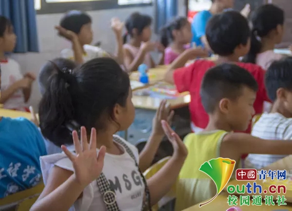 小朋友跟着志愿者进行手语练习。(中国青年网通讯员 邹振瑜 摄)
